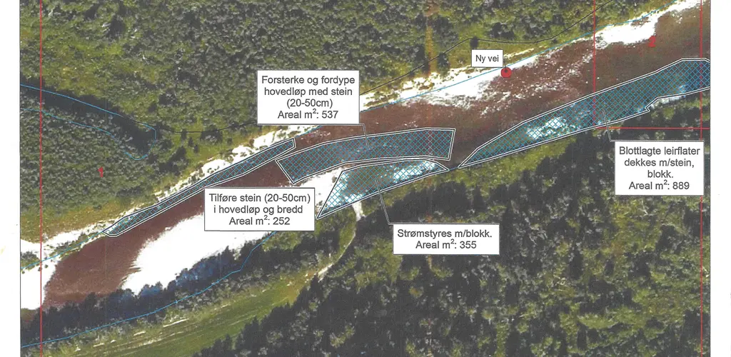 Dette innebærer: ‐ Utdyping og steinutlegging i strykpartier og hovedløp (djupålen) for å skape bedre skjultilgang ‐ Plastre blottlagte leirflater med grov stein og blokk ‐ Bygge "elv i elva" med utgraving av stryk ‐ kulp og steinsetting på ett område hvor elva tidligere har vært svært utrettet for å skape mer hydraulisk variasjon, skjul og standplass for fisk. ‐ Legge ut store steinrøyser med grov stein og blokk i djupområder og høler for å sikre skjul for ungfisk (vinterhabitat) og standplasser/skjul for voksen fisk. ‐Utlegging av store steinblokker i noen høler.